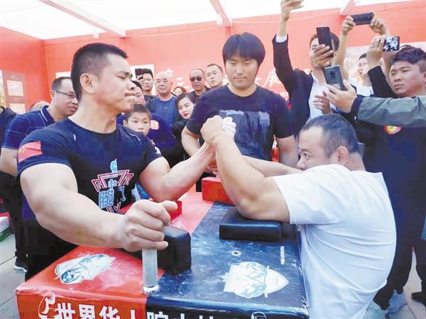 2011全国腕力王昆山争霸赛90公斤级别冠军、无级别组冠军赵子瑞(前左)参加“佳利地产杯”周口腕力公开赛。 记者 王凯 摄