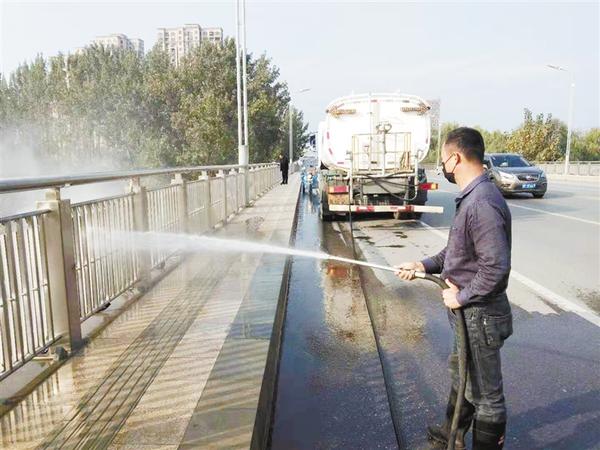 10月23日下午,市城乡一体化示范区工作人员在清洗中心城区周口大道桥护栏及周边路面,给市民营造一个干净环境。 记者 张洪涛 摄