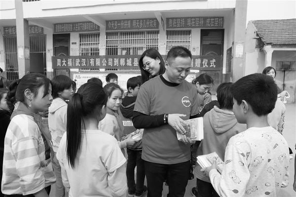 本报讯 10月24日,由周大福集团15名员工组成的义工队,来到郸城县丁村乡徐庄小学,为200余名学生送去爱心礼包。此外,他们还为两户贫困户送去了米、面、油等慰问品。