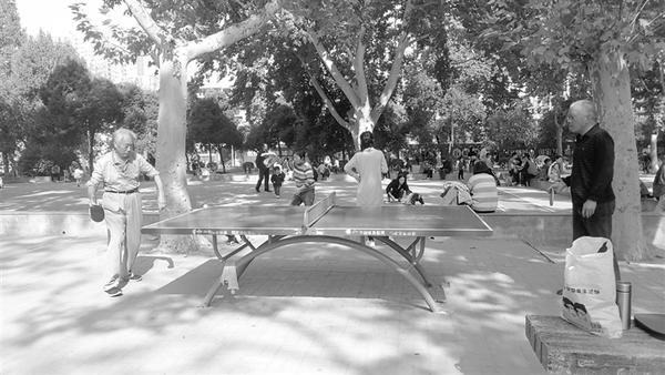 10月20日,两位老人在周口人民公园打乒乓球。近日,我市秋高气爽,温度适宜,特别适合老年人到室外健身。记者 关秋丽 摄
