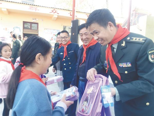 10月27日下午,川汇区人民武装部在城北办事处邵寨行政村举行军民共建爱心捐赠活动,为全村155名少年儿童送来书包、文具盒等学习用品。