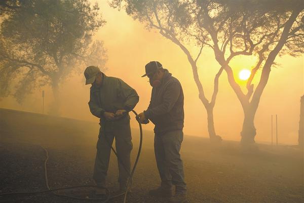 当地时间10月30日,在美国加利福尼亚州锡米瓦利,居民参与灭火行动。