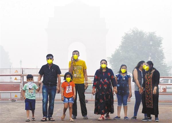 11月3日,在印度新德里,人们戴口罩进行户外活动。