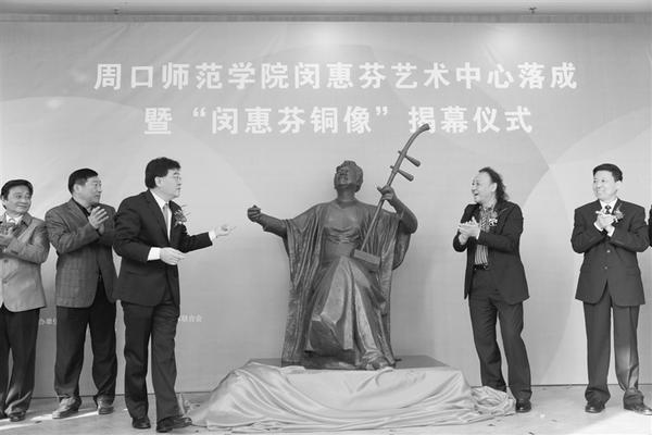 在闵惠芬铜像揭幕仪式上,中国文联党组成员、副主席李前光,中国音乐家协会分党组书记、驻会副主席、秘书长韩新安,河南省文联党组书记王守国,河南省音乐家协会主席周虹,周口师范学院党委书记王云彪和闵惠芬家属刘振学先生共同为闵惠芬铜像揭幕(如图)。
