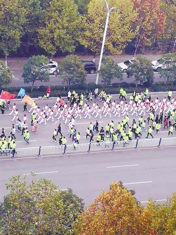 11月17日上午,万余跑友从市体育中心出发,先后经过和谐公园、植物园、周口公园、沙颍河风景区等景色优美之地,可谓一路奔跑,步步是景,处处如画。这是跑友经过层林叠嶂的周口大道。记者 窦赢 摄