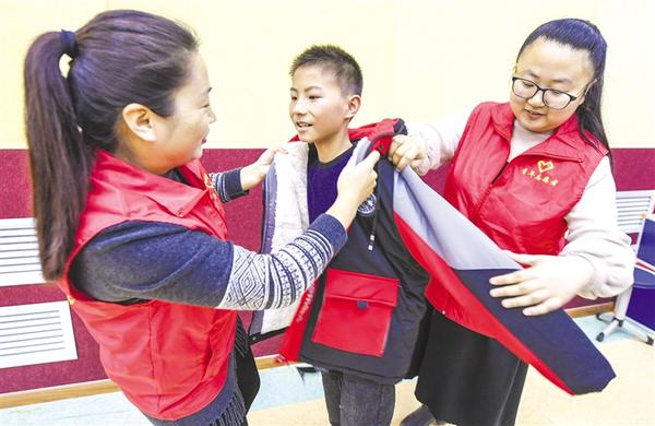11月21日,河北省故城县爱心人士向衡德小学六(9)班学生刘欣彬赠送棉衣。