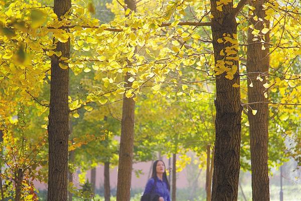 近日,市经济开发区人民广场,金黄色的杨树叶在阳光照耀下熠熠生辉,给城市增添一抹亮色。张振海 摄