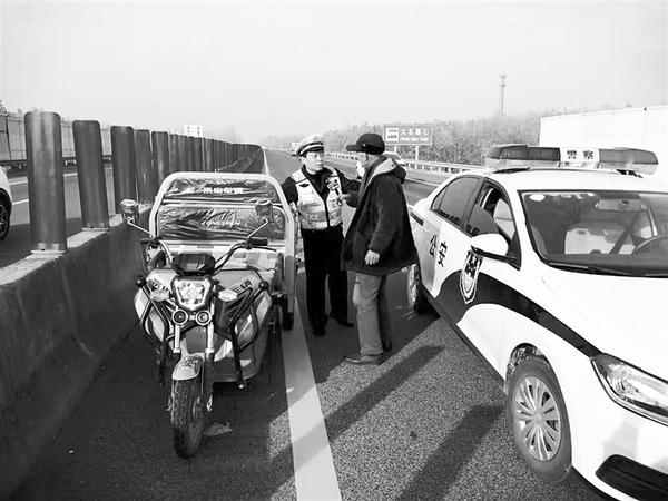 当日15时许,市公安局交通管理支队高速二大队接到高速路警指挥中心指令:大广高速周口段2001公里附近有一辆电动三轮车逆行。接警后,高速二大队项城西中队中队长陈安全带领队员王光宇、任春胜迅速赶往指定地点。到达现场后,陈安全三人发现一位老人正骑着电动三轮车在高速公路超车道上逆行。
