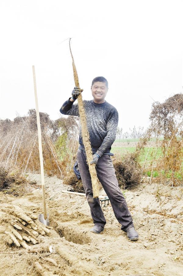 11月27日,在周口市城乡一体化示范区许湾乡肖王庄的田野里,几名挖山药的人手拿一人多高的特制钢锹,时而挺立,时而曲膝,时而伏身,从两米多深的土壤里挖出一根根碗口粗的山药。他们就是周口挖山药职业人。