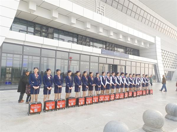 与百位乘客同行的,还有20位靓丽的“高铁乘务员”,她们是佳利地产请来的模特,统一着装,头戴贝雷帽,颈系丝巾,身穿深蓝色西装短裙,手拖行李箱,完全高铁乘务员装扮。她们准备在不同场合,用精彩的“高铁快闪秀”来传达周口首通高铁的激动与喜悦。