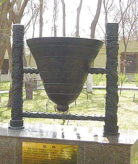 欹器又被称为歌器,是大禹手下第二号人物伯益设计制作的一件警戒器。设计很奇特:有双耳可以悬挂,底厚而收尖,利于水不满时向下垂直;口薄而敞开,利于盛满水时倾倒。水自上匀速滴入,形成自动滴水、倾倒水、空瓶立正,循环往复的周期性。它虚则欹,中则正,满则覆,即瓶空的时候略倾斜,滴入水后向下垂直,水满则立即倾覆,用以告诫大家“满招损,谦受益”的道理。“满招损,谦受益”出自《尚书》,是伯益和领导探讨治国策略时讲的,并特意制作“欹器”以示警戒。