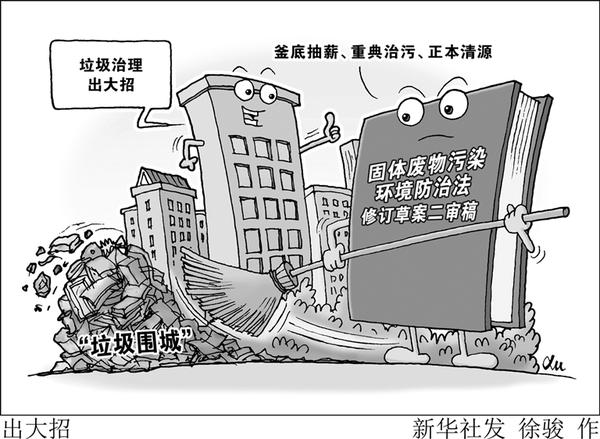 旅游、餐饮等行业应当逐步推行不主动提供一次性用品;对危险废物经营活动违反法律的老板和“临时工”一并重罚;实现垃圾分类制度有效覆盖……近日提请全国人大常委会审议的固体废物污染环境防治法修订草案二审稿,为根治“垃圾围城”顽疾亮出诸多大招实招。新华社发 徐骏 作