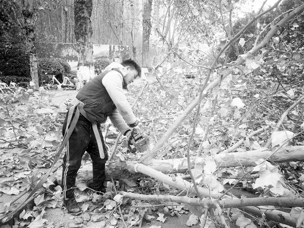 本报讯 昨日,有市民致电本报称,中心城区周口大道的行道树的树枝被锯掉了。当日,记者在周口大道建业森林半岛小区附近看到,工作人员正站在树上修剪树枝,树下的慢车道和人行道堆满了树枝和树叶,过往市民只能绕道而行。