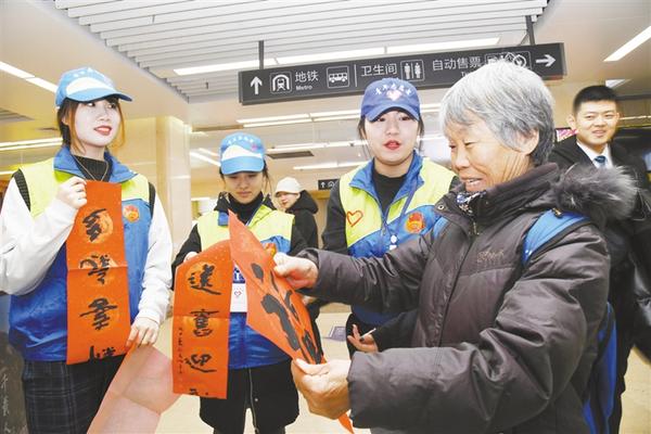 1月14日,青年志愿者在青岛火车站志愿者服务驿站为旅客送上“福”字和春联。