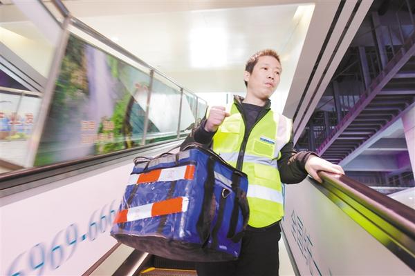 在南昌西站,配送员马涛乘坐电梯返回配送中心(1月18日摄)。