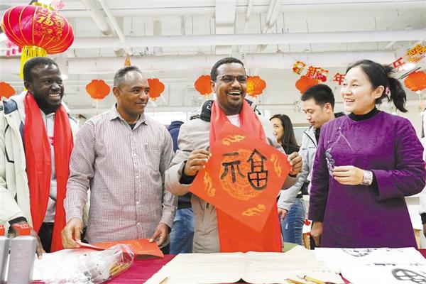 1月20日,来自埃塞俄比亚的留学生孟德(左三)展示自己写的福字。