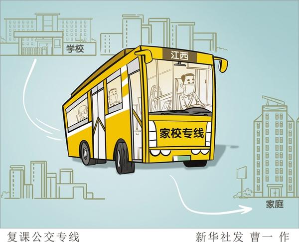 4月7日起,江西高三、初三年级学生返校学习。为方便学生“点对点”往返于家庭与学校,南昌、抚州、鹰潭等地积极组织辖区内公交企业与学校对接,因地制宜开通复课公交专线。新华社发 曹一 作