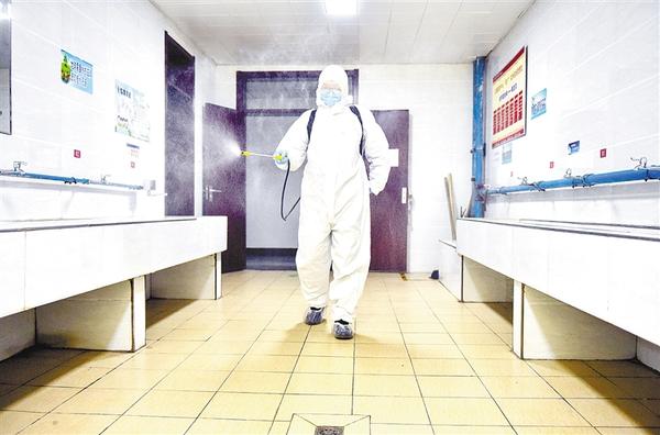 4月9日,在太原理工大学明向校区学生公寓楼,工作人员在给盥洗室消毒。