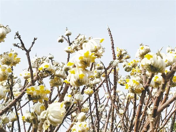 花在枝条的顶端,一朵朵小小的明黄色的花儿簇拥成一个个花球,毛茸茸的,挂在枝头,似一个个小婴儿梦中绽放的微笑,可爱极了。结香先开花,后长叶。褐色的枝条没有叶子的覆盖,在娇艳花朵的对比下,感觉很沧桑。尤其是那几枝弯弯绕绕地打着结的枝条,虽然扭曲着,却也超越疼痛努力地在向上生长,那一个个结也长成枝的一部分,开出一簇簇明艳的花朵。
