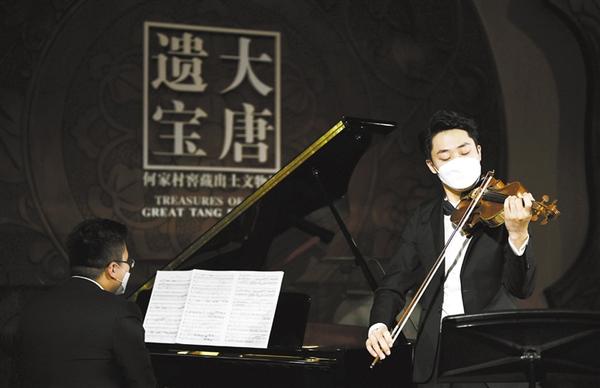 4月14日,西安交响乐团的十余位演奏家在陕西历史博物馆大唐遗宝展厅为即将于4月18日举行的首场“云上国宝”音乐会进行彩排,这是西安交响乐团小提琴首席周虎翼(右)在进行排练。
