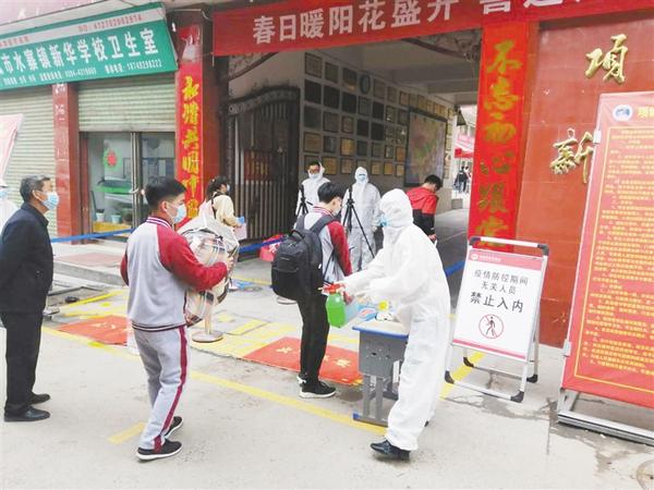 在周口十九中,记者看到,一大早,该校全体教职员工就已准备就绪,分别在校门口和教室内等候初三学子的到来。据了解,复学首日,该校安排了60余名教师在校门口维持秩序,此时的他们既是安全员又是防疫员。