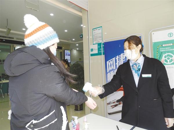 农行周口分行营业网点复工后,认真履行上级行在疫情防控期间的各项工作部署,做到守土有责、守土担责、守土尽责,以精准防控为抓手,配足口罩、洗手液、消毒液、体温测量仪、一次性手套等防疫用品,确保金融服务不断提升和疫情防控不松懈。图为近日农行西城区支行工作人员在营业网点入口处为客户测量体温。