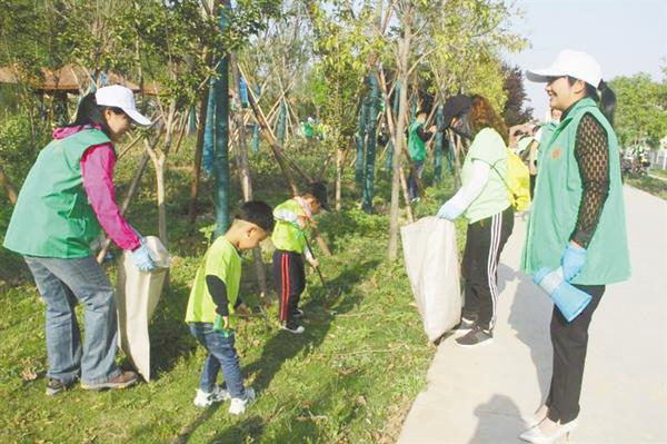 4月26日,来自市区的20多名小志愿者与家人一起相约沙颍河畔,参加“大手拉小手 环保伴我行”活动。图为志愿者在捡拾垃圾。 记者 王晨 实习生 叶明玉 摄