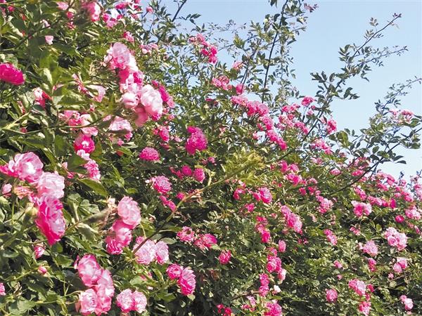 在一片花朵的密集处,有枝蔓伸展出来,行走其间,有被蔷薇花包围的感觉,同时也被它的花香浸透。微风一吹,香云落向衣袂。大片的红粉之中,偶遇一枝雪白——粉与白,都因对方的存在而更精彩。看着深深浅浅的粉,再加上粉白的相映,突然就想起清代一位诗人说尽蔷薇美态:“……满架花光艳浓。浓艳,浓艳,疏密浅深相间。”
