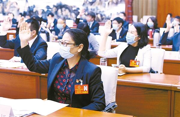 5月13日上午,市四届人大五次会议举行第二次大会,参会代表表决通过大会各项决议草案。记者 孙安平 摄