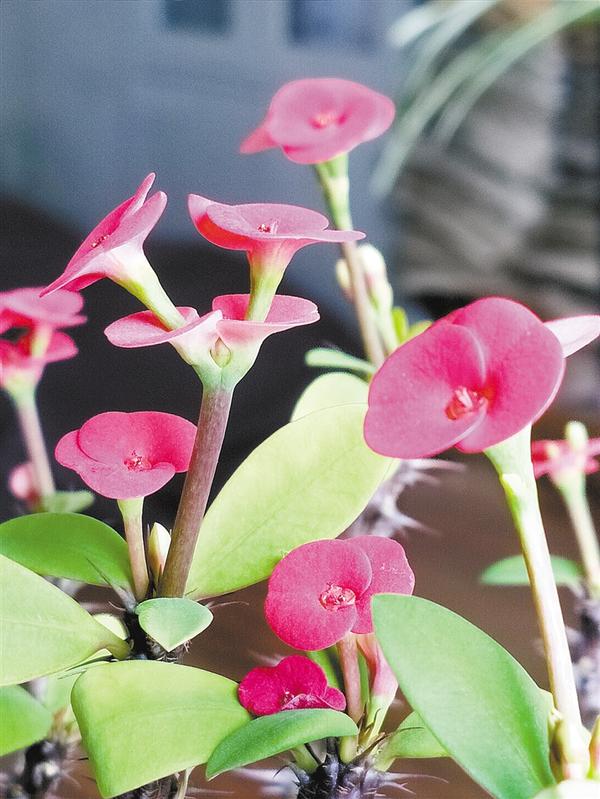 据说,铁海棠的花期,一般3~4个月,最长可达6个月。我这一小盆终年开花不绝,经久不谢,可能是因为办公室朝阳和光照温度都很适宜吧。