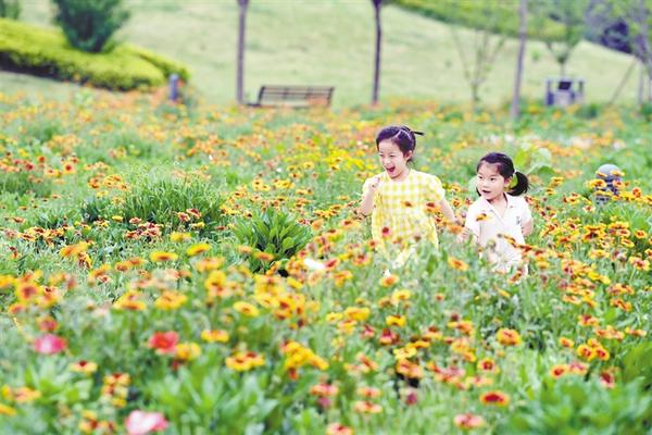 5月17日,两名小朋友在中心城区沙颍河畔的花海中奔跑。近日,在周口大道桥东的沙颍河南岸,成片的天人菊等花卉相继盛开,犹如五彩的花海,吸引不少市民前来游玩、拍照。