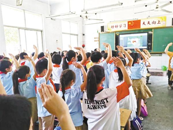 该校全体师生面向屏幕中的国旗高唱国歌。二(5)班学生朱格文瑾说:“我是祖国接班人,祝愿疫情早日过去。”记者 朱东一 通讯员 丛艳华 摄