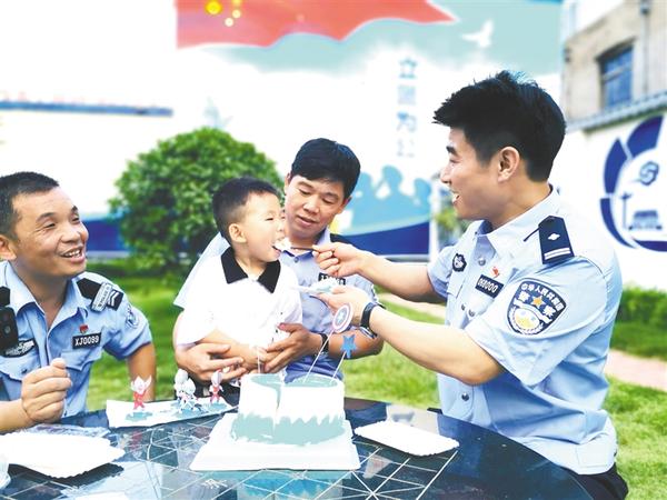 6月1日,4岁多的小鹏鹏在市公安局城北分局已经生活了近150天,警察爸爸们对他疼爱有加。儿童节的当天,按照局长朱成刚的安排,治安大队大队长孙千成给小鹏鹏买来一个蛋糕,孩子一口气吃了大半块,在警营度过了一个特殊的儿童节。据悉,小鹏鹏的爸爸于2018年12月涉案被城北分局抓获,今年初小鹏鹏因无人照顾就生活在城北分局。 记者 陈永团 摄