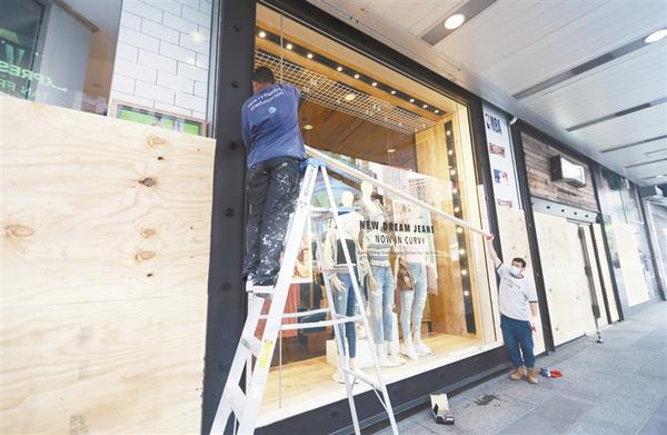 美国明尼苏达州白人警察暴力执法导致非洲裔男子乔治·弗洛伊德死亡,由此引发的抗议示威活动连日来在全美持续蔓延,多地发生骚乱和暴力冲突。抗议活动在纽约已经持续5天,当地主要商业区的商户纷纷加装围挡或护板,保障自身安全。