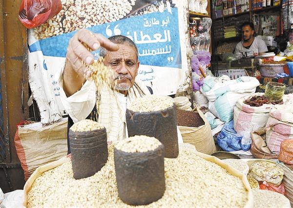 6月2日,商贩在也门首都萨那的市场上出售粮食。