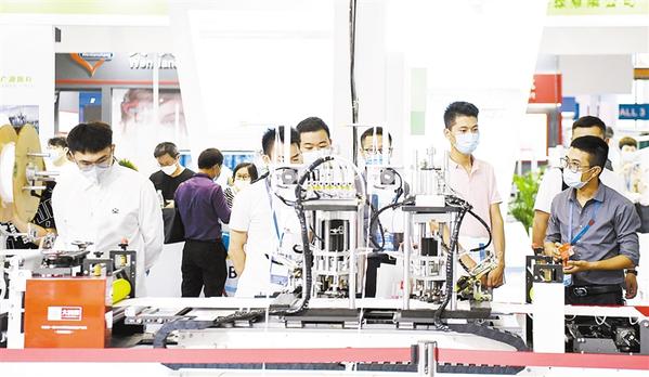 6月10日,观众参观展会上的一台口罩生产设备。
