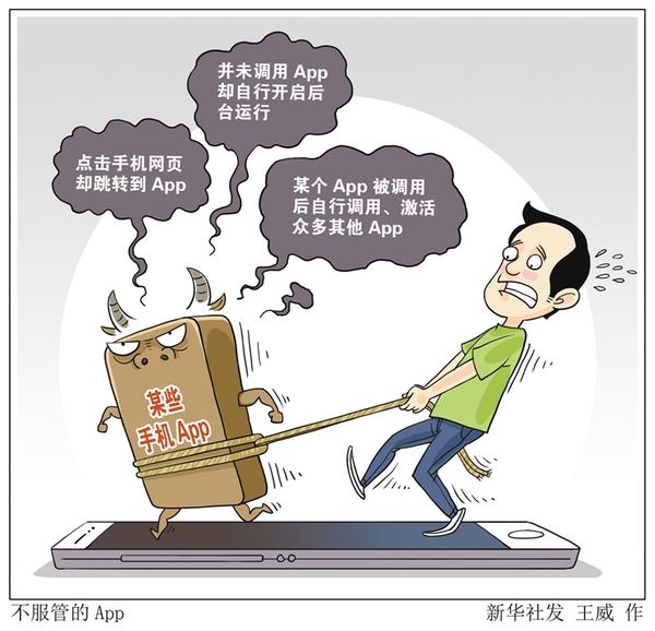“点击手机网页却跳转到App”“并未调用App却自行开启后台运行”“某个App被调用后自行调用、激活众多其他App”……部分手机App持续“任性不服管”,不仅让用户无奈,也损害用户权益,造成安全隐患。新华社发 王威 作