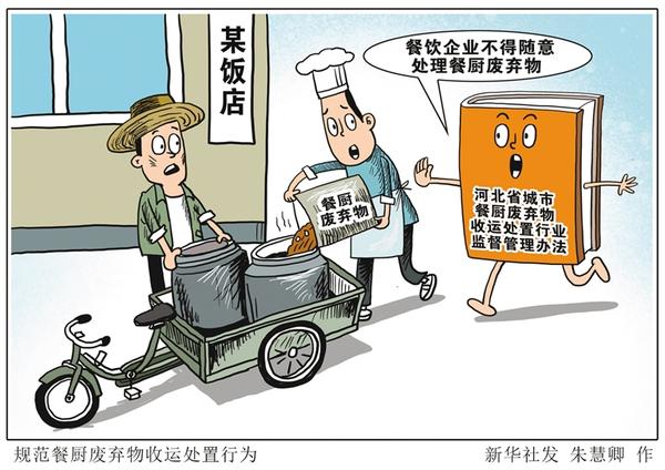 记者从河北省住房和城乡建设厅了解到,为规范餐厨废弃物收运处置行为,河北省出台《河北省城市餐厨废弃物收运处置行业监督管理办法》。按照规定,餐饮企业需与取得经营许可的企业或相关政府职能部门签订收集运输协议,不得将餐厨废弃物随意交与其他企业或个人处理。新华社发 朱慧卿 作