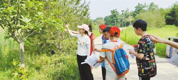 本报讯 6月27日,周口沙颍河风景区,花木葱郁,绿意盎然,好几拨头戴“周口报业小记者”红帽的孩子在老师带领下徜徉其间,近距离接触植物世界,了解常见花木的分类、形态特征和生活习性,在端午节假期上了一堂生动有趣的“研学自然课”。