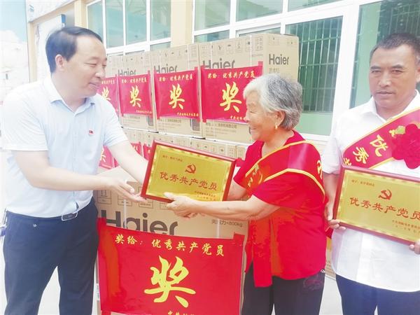 6月30日,淮阳区刘振屯乡耿楼村老党员程守兰(中)被乡党委授予“优秀共产党员”称号。当天,该乡包括程守兰在内的35名优秀共产党员获得表彰。据了解,在中国共产党99周年华诞之际,周口市多个乡镇隆重表彰了在疫情防控、农村人居环境整治等工作中表现突出的共产党员,进一步激励基层广大党员坚定信心,振奋精神,凝心聚力决战脱贫攻坚、决胜全面小康。