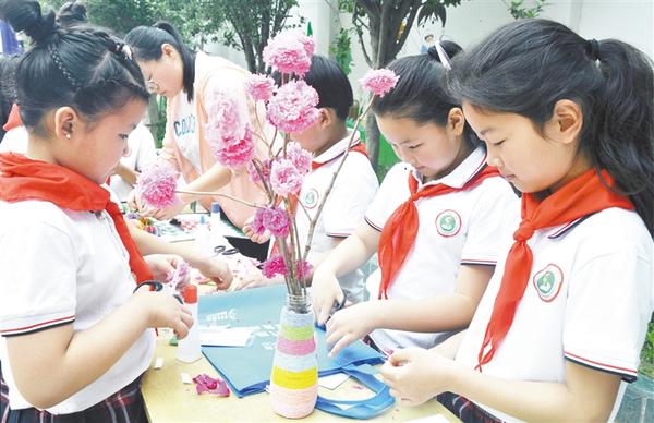 放暑假了,许多中小学生根据自己的爱好,报名参加了足球、美术、舞蹈等兴趣班。这些兴趣班使孩子们的假期生活变得丰富多彩,也让他们更充实、更自信、更快乐。图为商水县新城学校的小学生假期里学习手工制作。