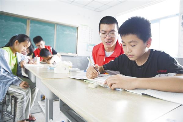 7月14日,在安徽省芜湖市鸠江区沈巷镇大蒋村沿路小学安置点,志愿者在辅导小朋友写暑假作业。