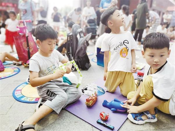 记者在现场看到,小朋友拉起了横幅,摆上了玩具,摇身一变“小掌柜”,纷纷拉货练摊、讨价还价、吆喝售卖。