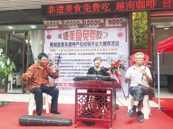 本报讯 7月25日上午,一场别开生面的非遗文化演出在郸城县府西路非遗特产文化体验店门前举行。郸城坠剧团演员表演了《回龙传》,秋渠柳剧团演员表演了柳琴演奏《歌颂郸城新变化》,双楼李氏父子为大家表演了道情等非物质文化遗产节目。店内免费品尝非遗特产,店外免费观赏非遗文化曲目,让市民既饱口福、又饱耳福。