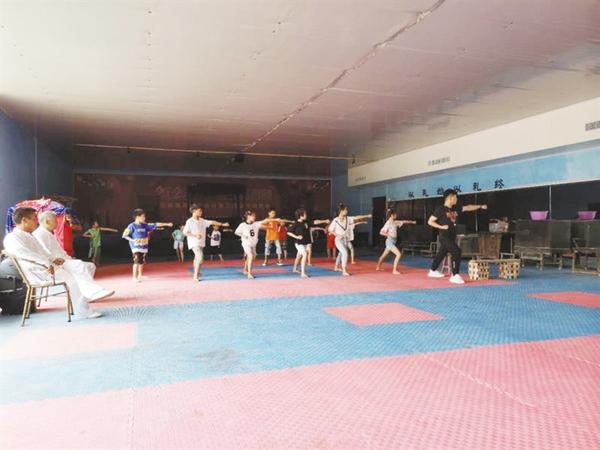 8月3日下午3时,在太康县张集镇蒋堂行政村武馆,孩子们在教练的带领下,正在练习民间武术大洪拳的基本功(如图)。这些孩子大的十三四岁,小的才五六岁,“嗨哈”之声不绝于耳。