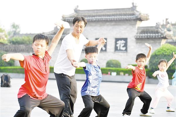 8月5日,在安徽省亳州市花戏楼广场,孩子们在教练的指导下练习武术。