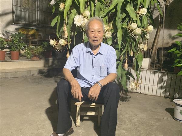 8月5日傍晚,在中心城区一座小院里,88岁的苗天才老人正在数着:“1朵、2朵、3朵……”据苗天才回忆,眼前的这株昙花树是1999年别人送的,至今已有21年树龄。“刚开始才到我的小腿处,现在长得比人还高。”这几天,老人一直在数结了多少个花骨朵,“大概有90多个,前一天开了20余朵,还有70余个花骨朵未开”,据多年养花经验,老人预测这70余个花骨朵将在8月5日夜开放。