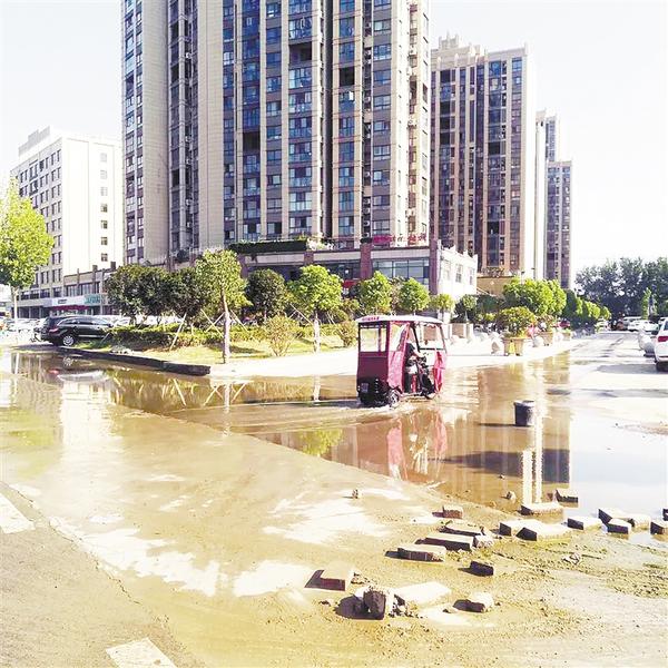 8月13日,在中心城区七一路东段周口市东杨庄果品贸易市场门口和锦绣江南小区门口,记者发现这段道路还有积水,给这里的居民出行造成不便。市市政管理处人员称,七一路东段两侧低洼区积水,主要原因是中原路排水管网施工正在进行,该区域雨水只能通过七一路管网逆流入至建安路及大庆路,造成排水不畅,问题将很快得到解决。图为一辆电动三轮车涉水出行。