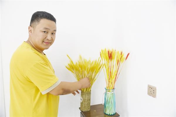 8月18日,商水县谭庄镇三李村村民正在演示染色小麦秸秆室内装饰艺术。