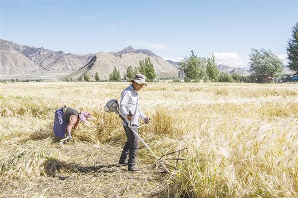 8月29日,农民在日喀则市江孜县的青稞田里忙收割。日喀则是西藏重要的商品粮基地,被誉为“西藏粮仓”。当前正值青稞收获季节,当地农民抓紧收割,农田里一片繁忙景象。